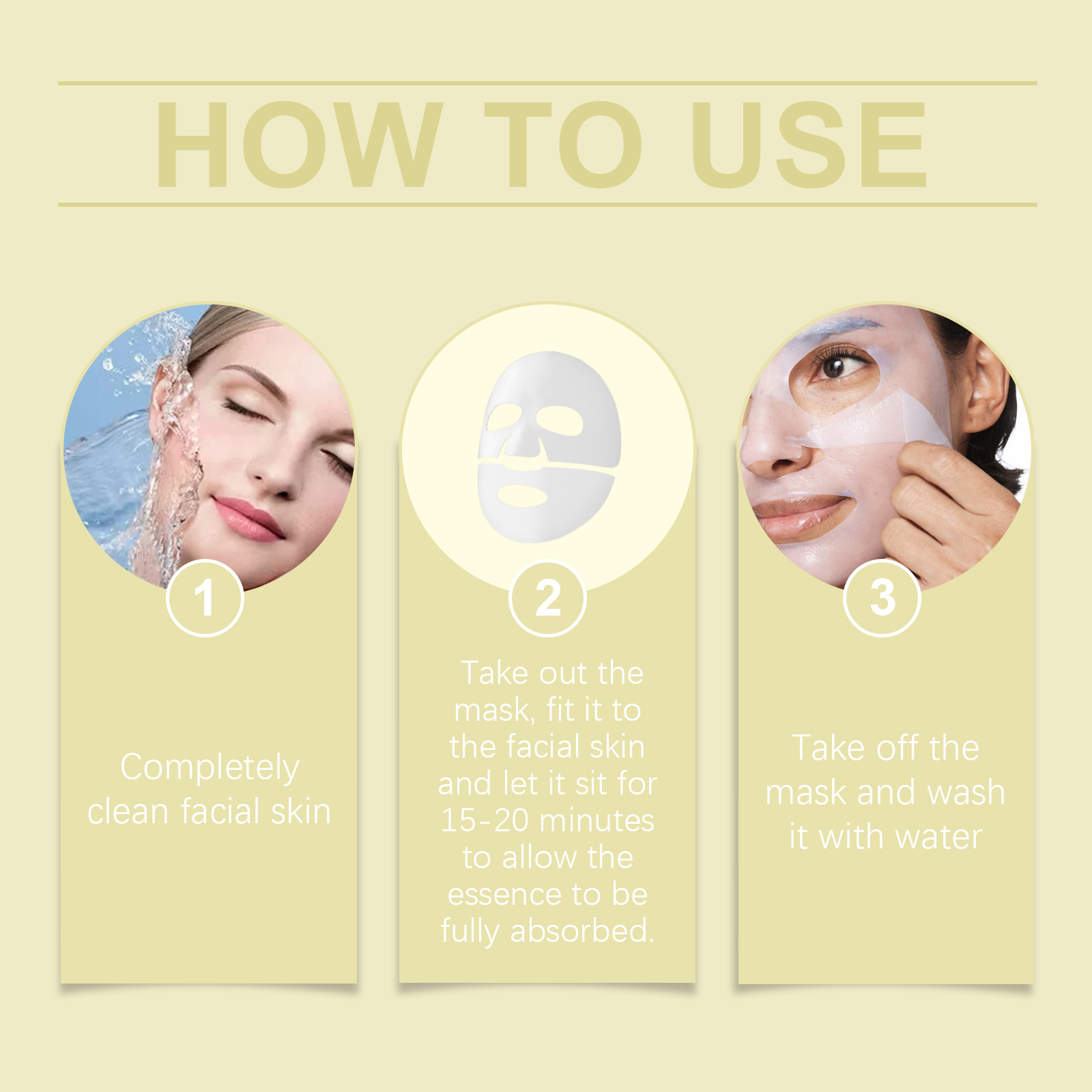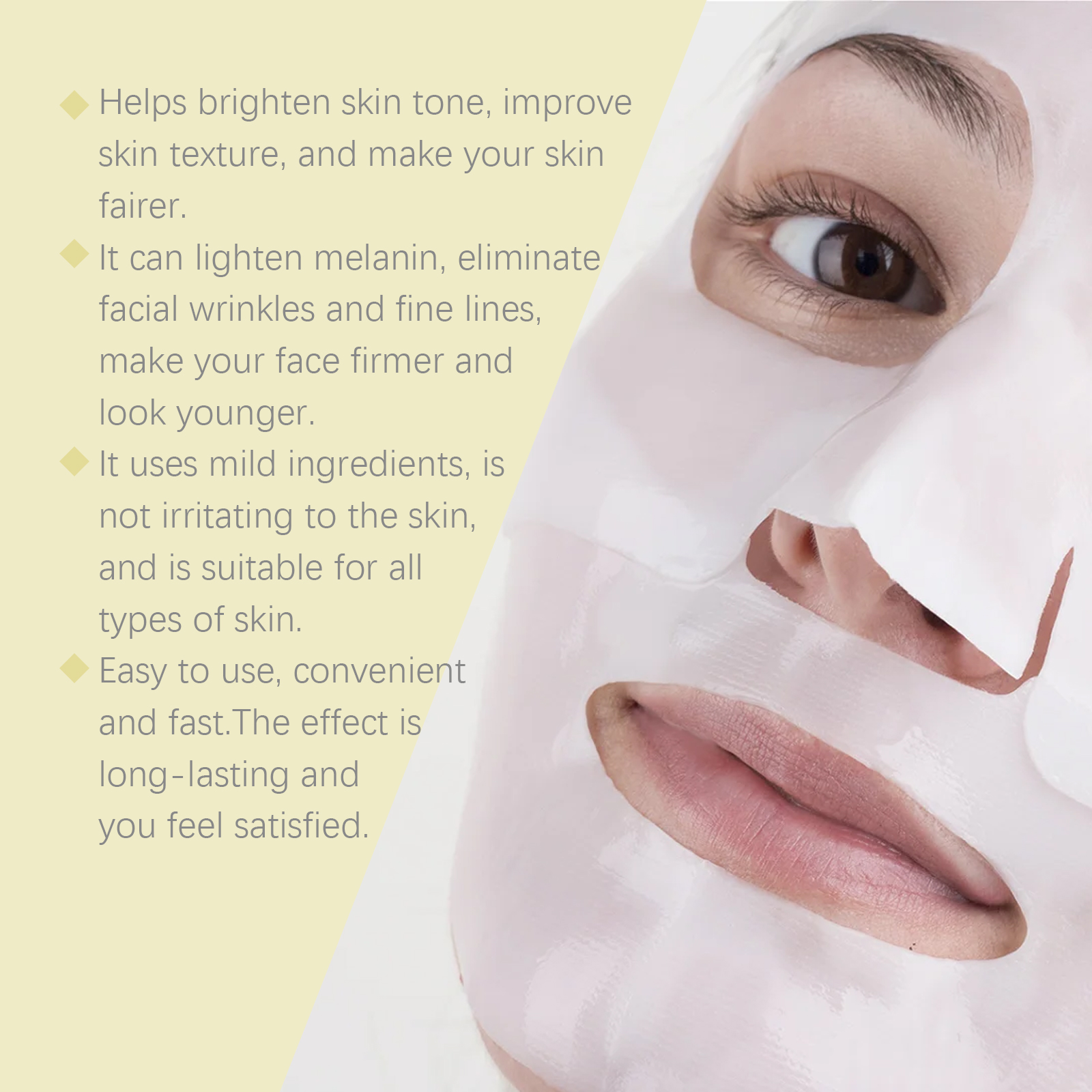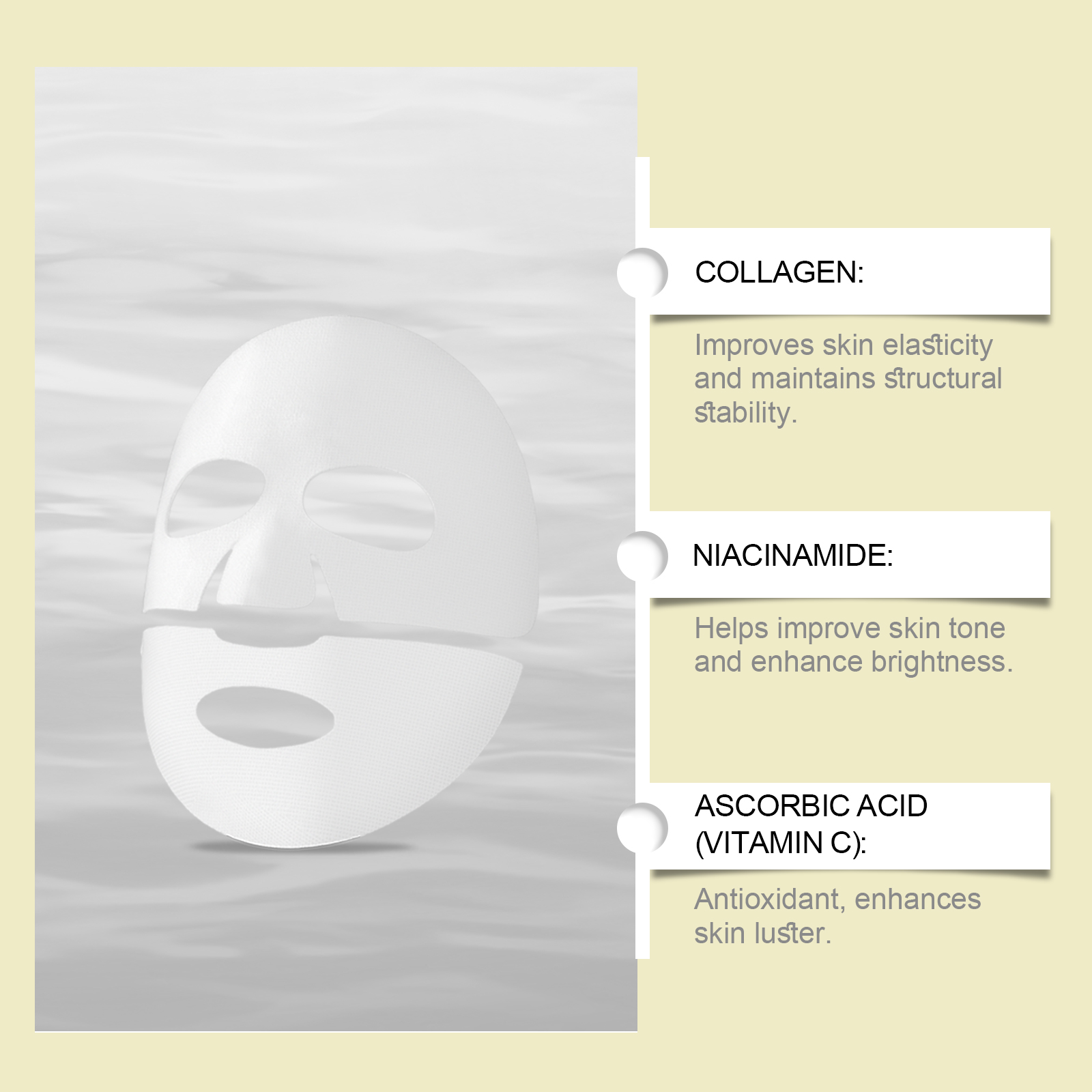 Our niacin and Vitamin C whitening mask (bagged) is carefully formulated with collagen, niacinamide and ascorbic acid. Designed specifically to provide the necessary nutrients for the skin. The usage method is extremely convenient: Thoroughly clean the facial skin, take out the mask, apply it to the facial skin, let it stand for 15-20 minutes to allow the essence to be fully absorbed, then remove the mask and wash it with clean water. And it can significantly enhance the skin's luster.