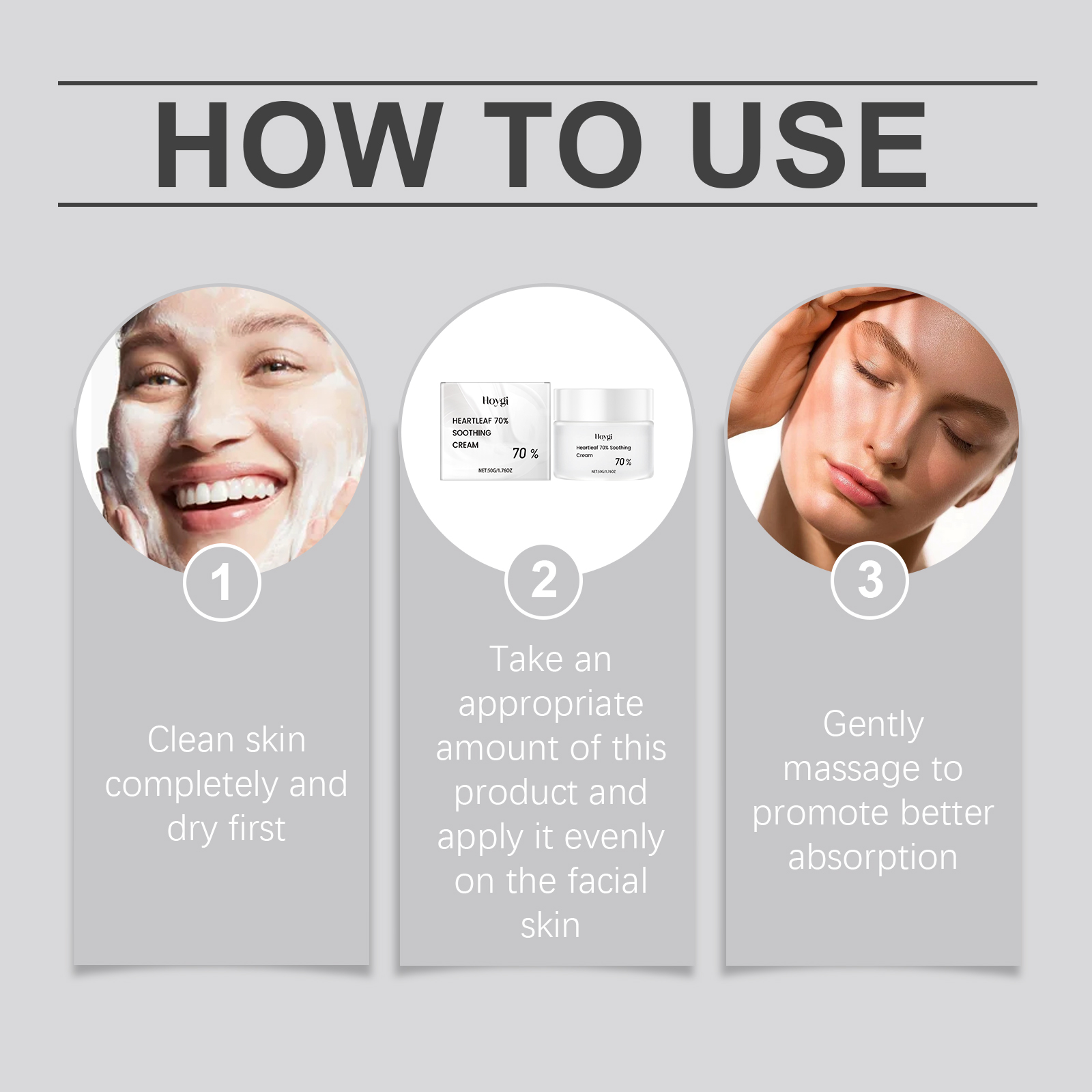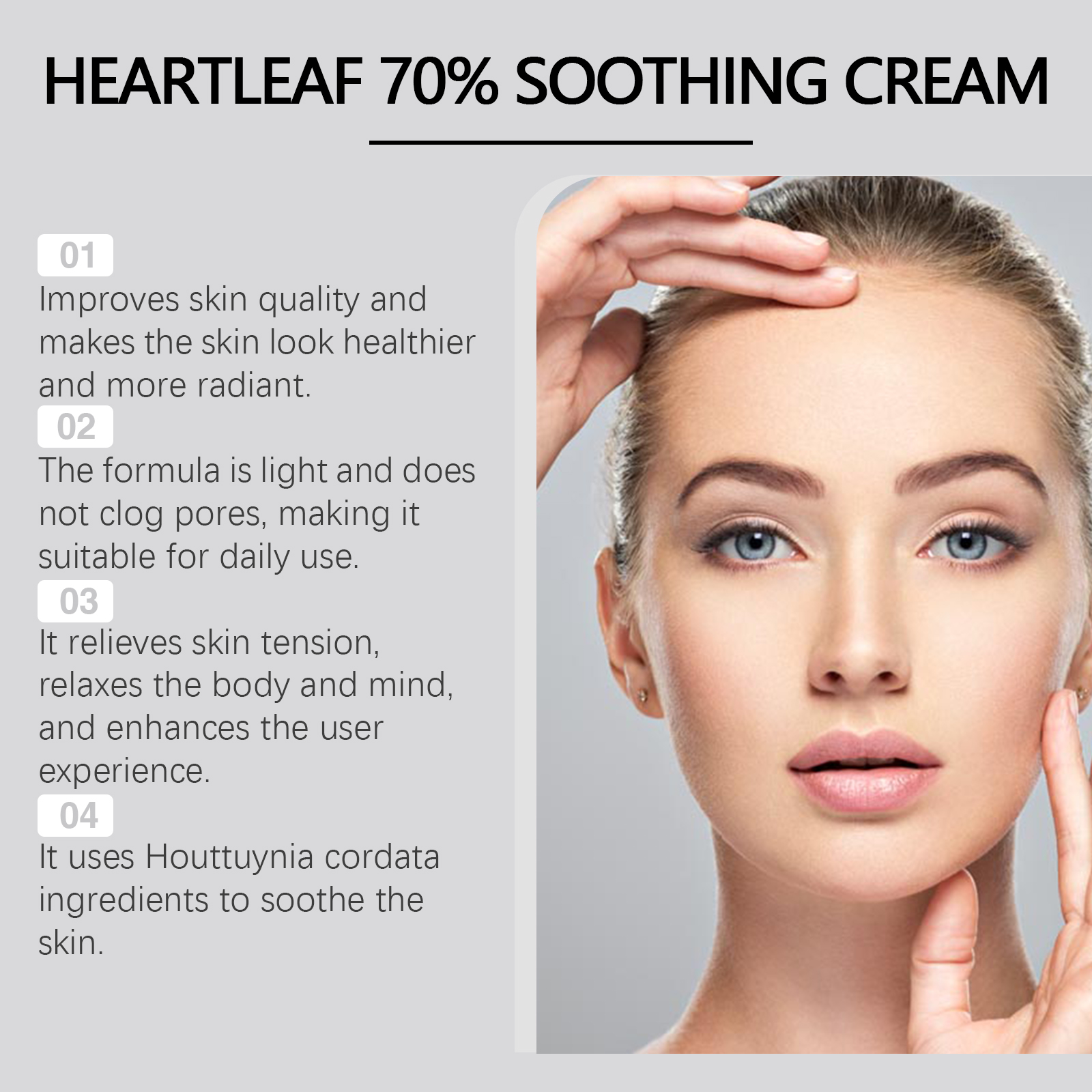Our heart leaf Moisturizing and Soothing cream contains glycerin, mineral oil and glycerin stearate. It can deeply moisturize the skin and keep it hydrated all day long. Its usage method is very simple: Thoroughly clean the skin and dry it first; Take an appropriate amount of this product and apply it evenly to the facial skin. Gently massage to promote better absorption. And it can effectively soothe skin discomfort, repair damaged barriers and reduce redness and swelling.