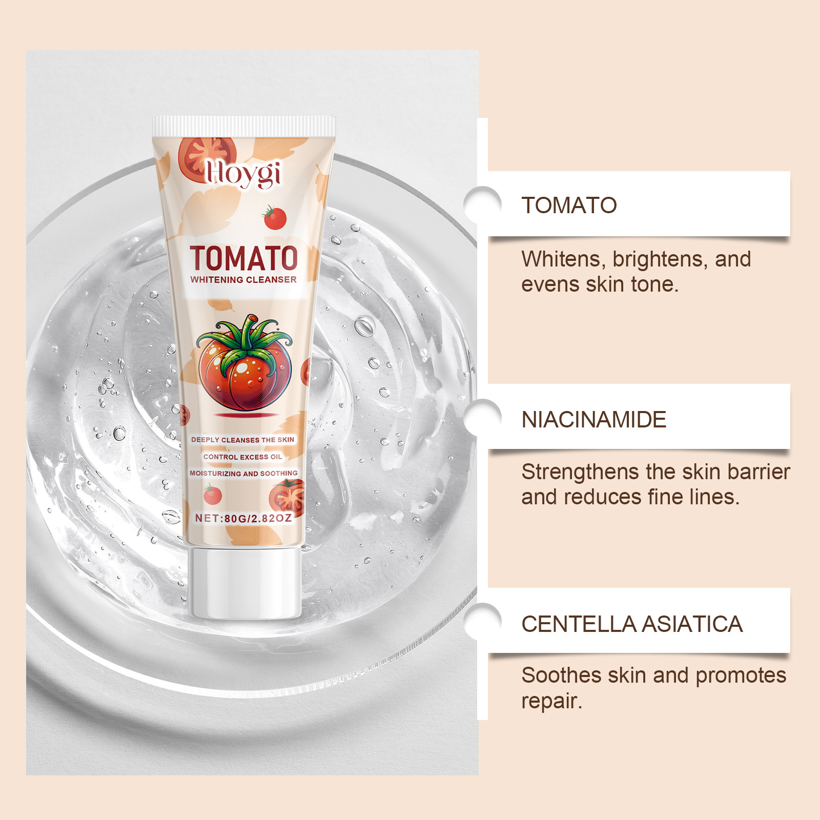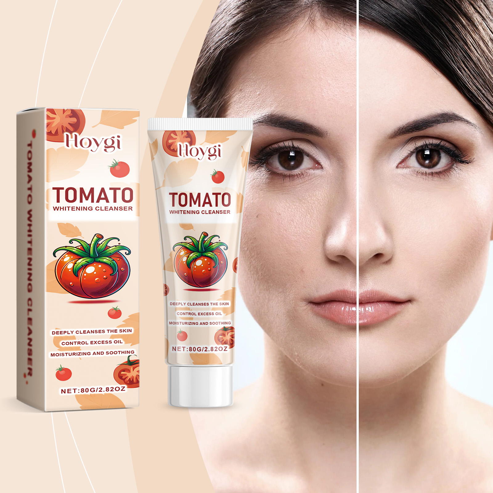 Our tomato cleanser contains tomato extract, niacinamide and Asiaticum extract. It can deeply clean the skin, effectively remove pore dirt, clean pores and residual cosmetics. Mild tomato formula, brightening skin, removing yellow, anti-oxidation. The way to use it is very simple: squeeze out an appropriate amount of facial cleanser, add water and mix. Knead into a creamy foam and gently massage into the skin. Finally rinse with water. It has a strong ability to control oil, leaving the skin clean and irritation-free, suitable for all skin types.
